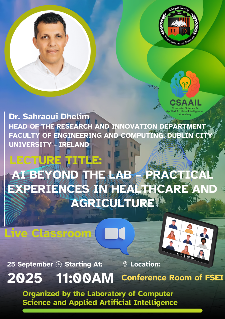 يسعد كلية العلوم الدقيقة والإعلام الآلي ومخبر الإعلام الآلي والذكاء الاصطناعي التطبيقي أن نرحّب من جديد بابن جامعتنا المتألّق الدكتور: ضيلم صحراوي، أحد خريجينا المتميّزين الذي شرف الجامعة بإنجازاته العلمية المرموقة في مجالات البحث والابتكار.