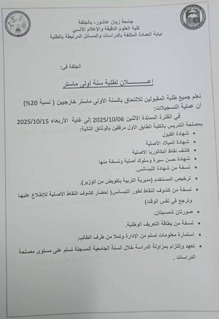 الرئيسية/مديرية الدراسات/اعلان للطلبة المقبولين ماستر 1 (نسبة 20%) اعلان للطلبة المقبولين ماستر 1 (نسبة 20%)