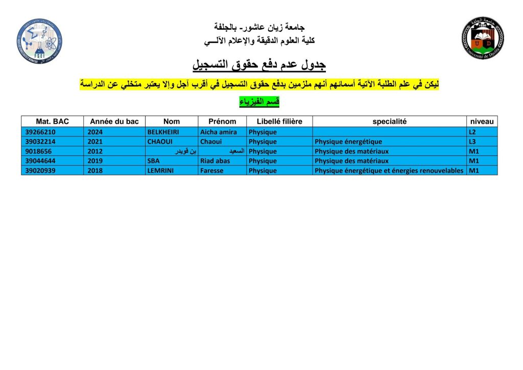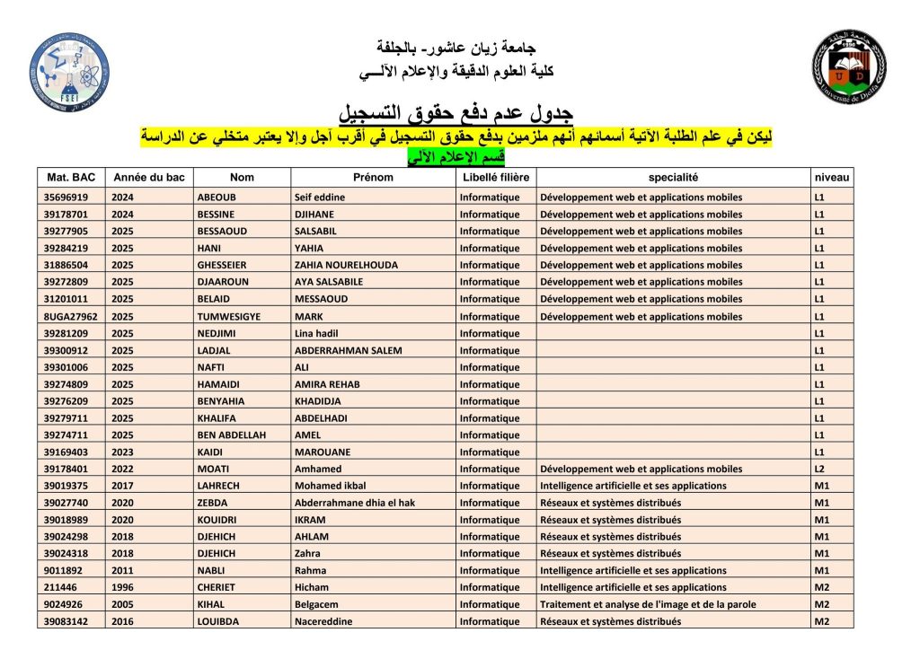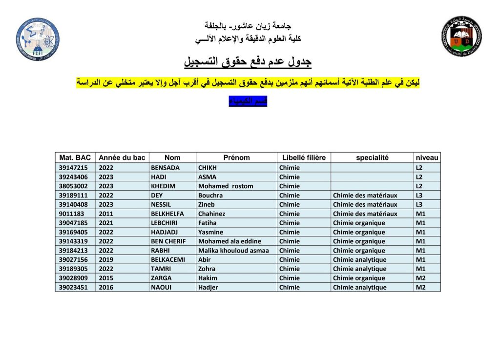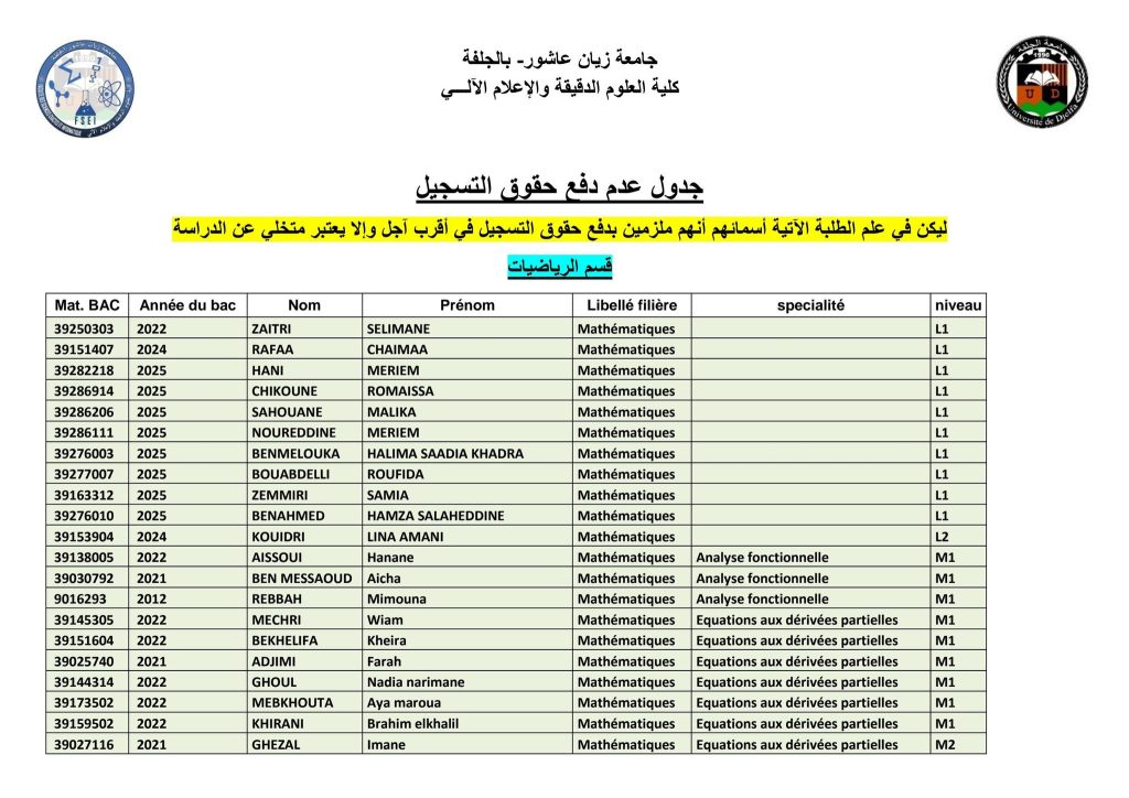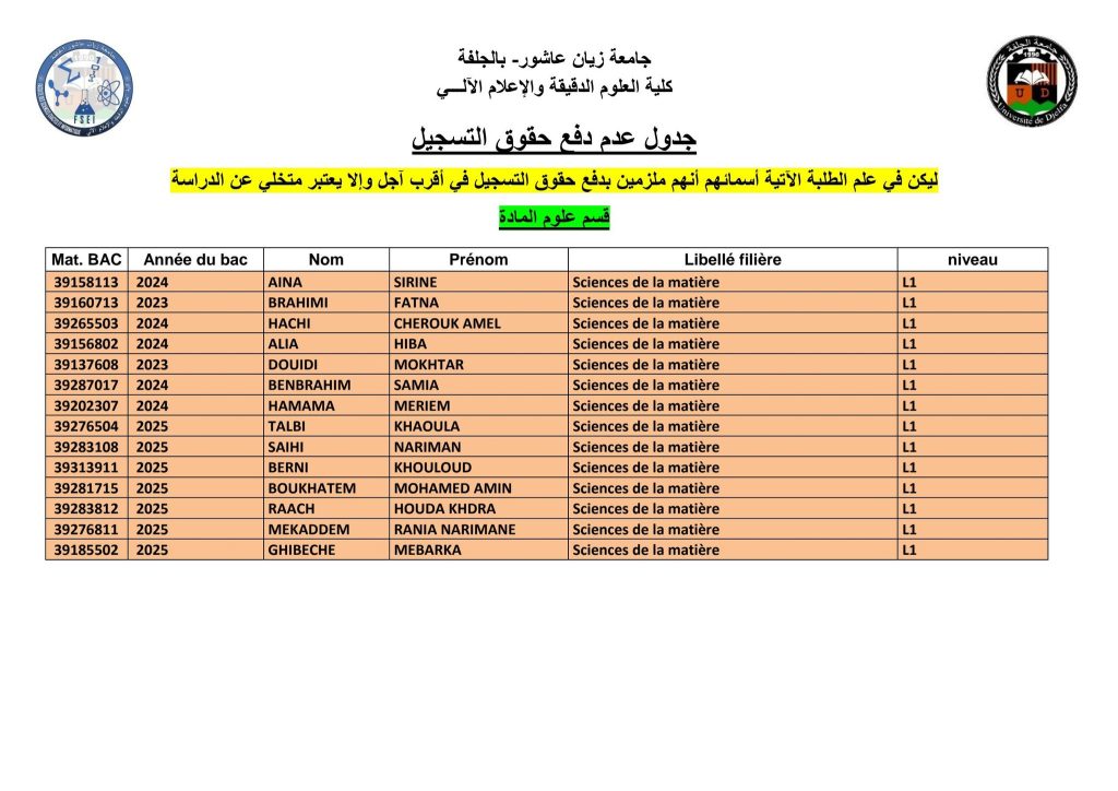 الرئيسية/مديرية الدراسات/قائمة المتأخرين عن دفع حقوق التسجيل (مدة إضافية) قائمة المتأخرين عن دفع حقوق التسجيل (مدة إضافية)