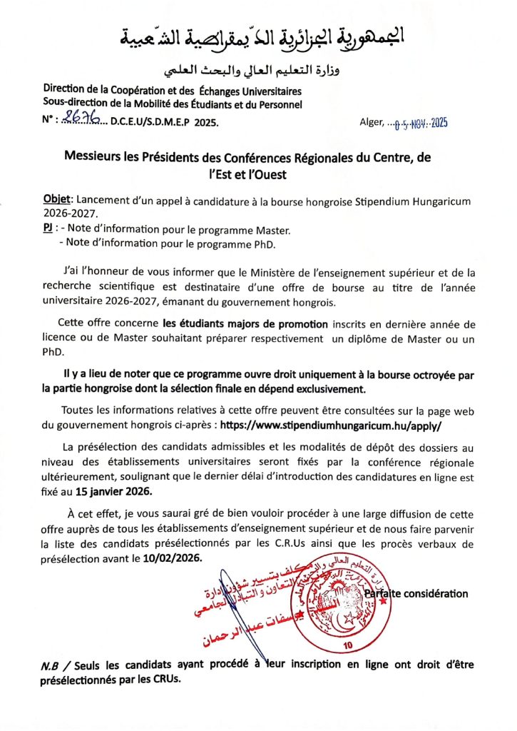 Appel à candidature Stipendium Hungaricum 2026- 2027