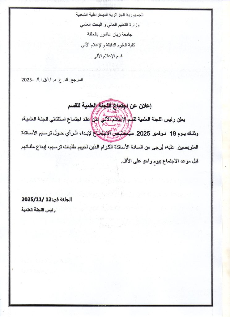 الرئيسية/قسم الإعلام الآلي/اعلان عن اجتماع اللجنة العلمية – قسم الإعلام الآلي اعلان عن اجتماع اللجنة العلمية – قسم الإعلام الآلي