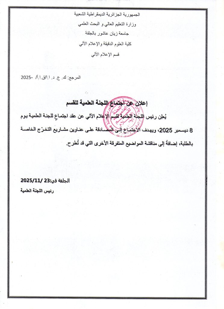 الرئيسية/قسم الإعلام الآلي/إعلان عن اجتماع اللجنة العلمية لقسم الاعلام الآلي إعلان عن اجتماع اللجنة العلمية لقسم الاعلام الآلي
