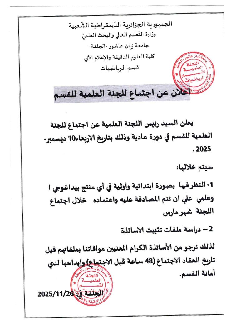 الرئيسية/قسم الرياضيات/إعلان عن اجتماع للجنة العلمية لقسم الرياضيات إعلان عن اجتماع للجنة العلمية لقسم الرياضيات
