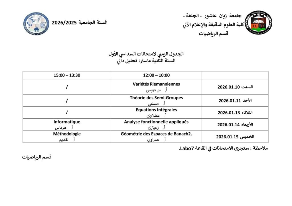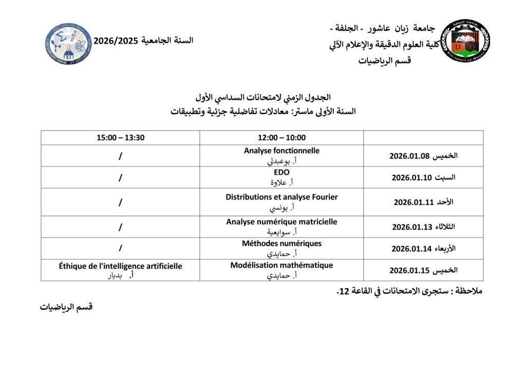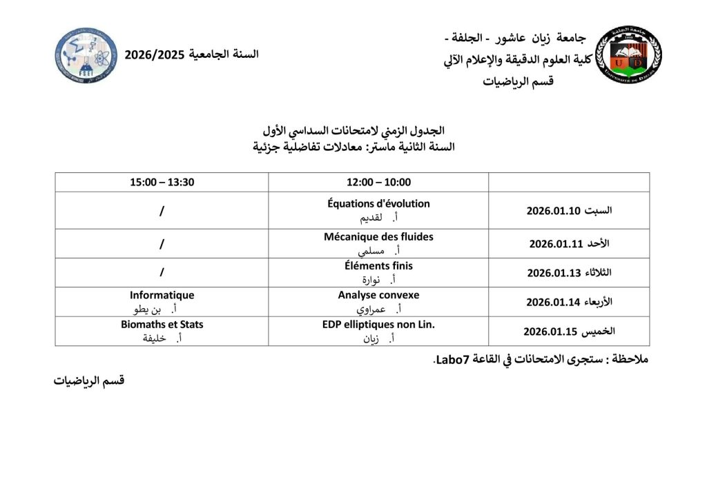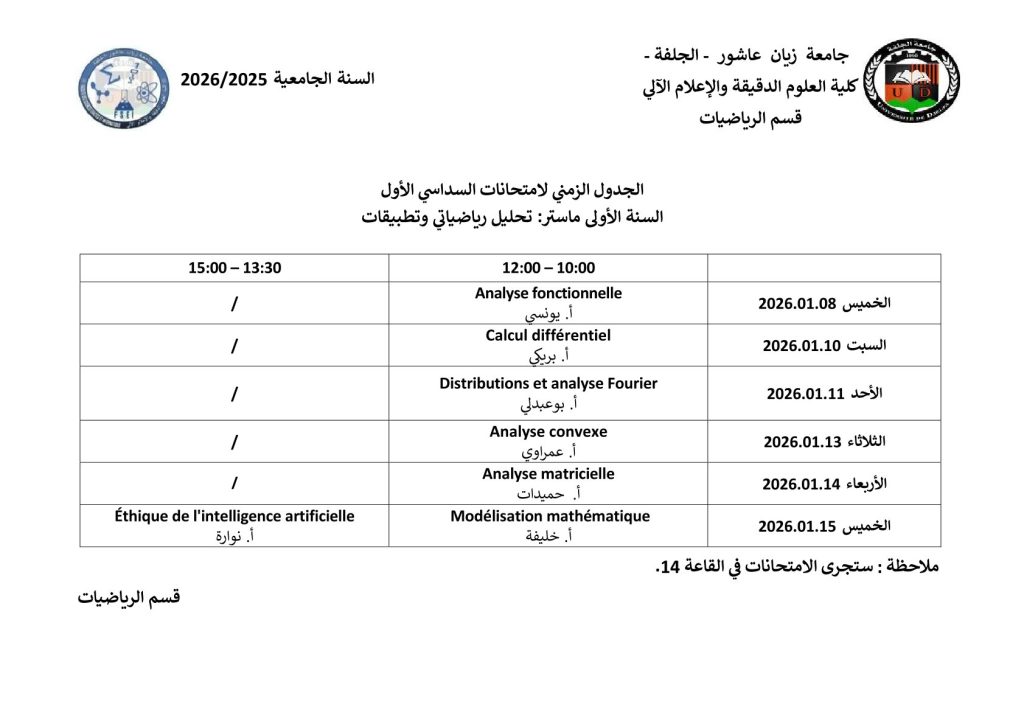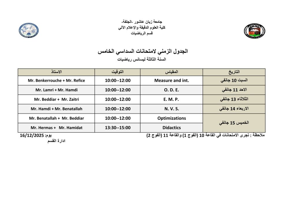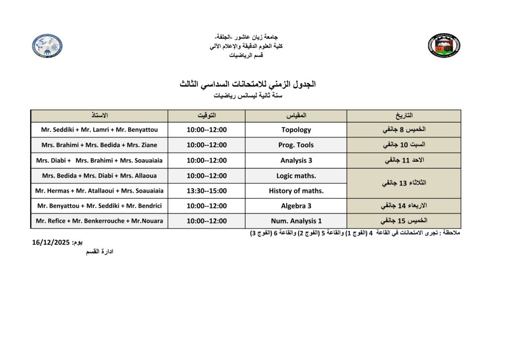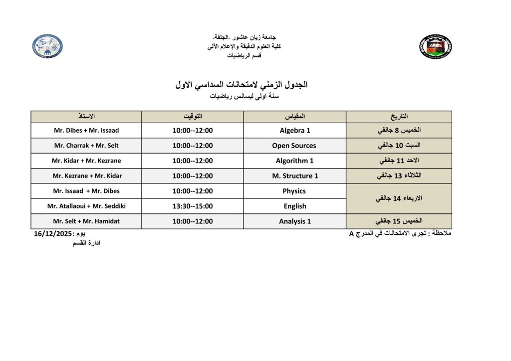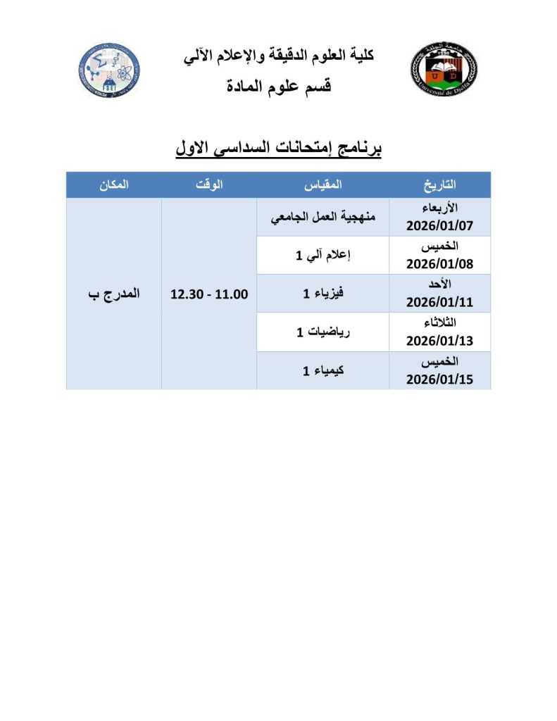 ليكن في علم الجميع أن امتحانات السداسي الأول ستُجرى في نفس التواريخ المعلن عنها سابقًا، دون أي تغيير.