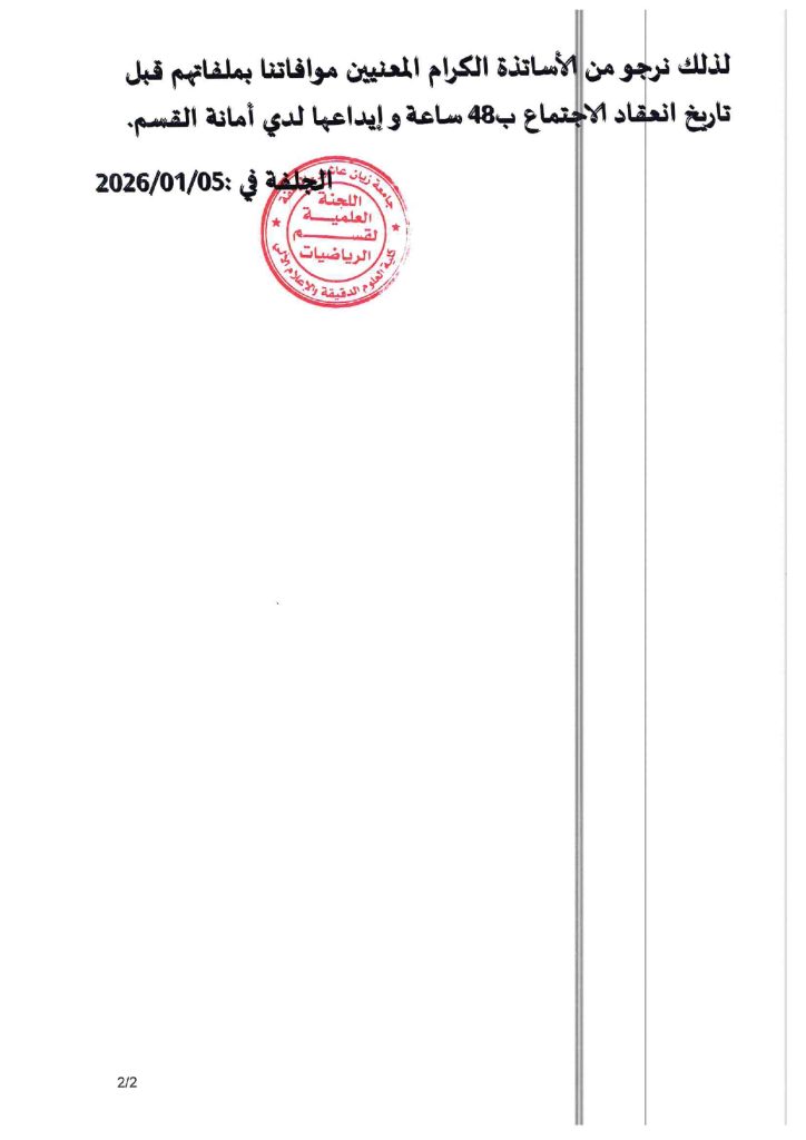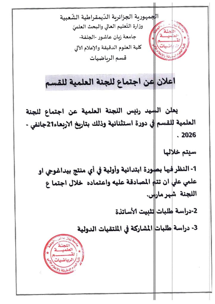 الرئيسية/قسم الرياضيات/إعلان عن اجتماع اللجنة العلمية لقسم الرياضيات إعلان عن اجتماع اللجنة العلمية لقسم الرياضيات