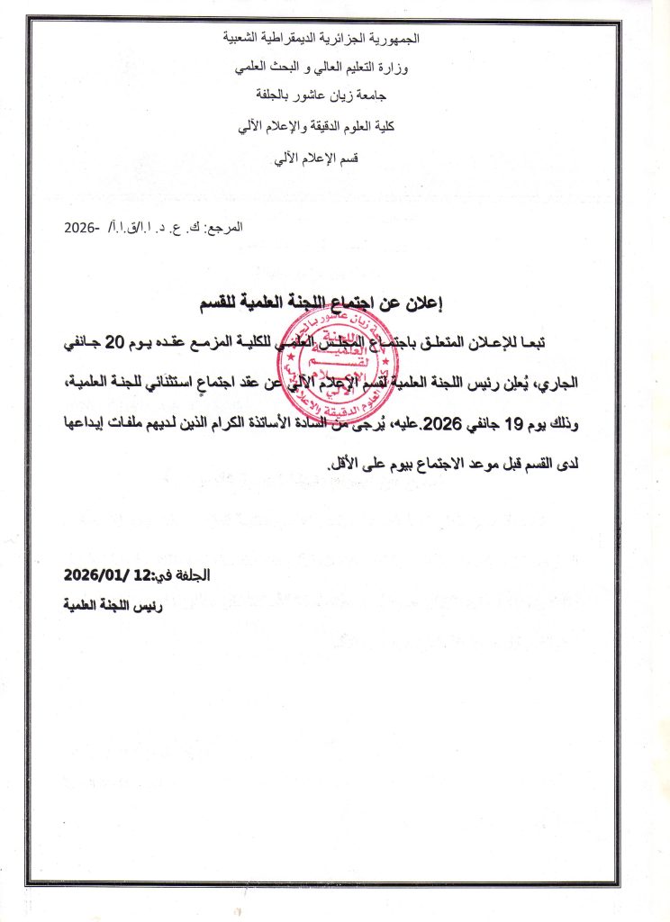 الرئيسية/قسم الإعلام الآلي/إعلان عن اجتماع اللجنة العلمية لقسم الإعلام الآلي إعلان عن اجتماع اللجنة العلمية لقسم الإعلام الآلي