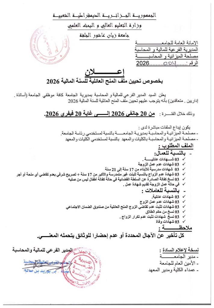 الرئيسية/الأمانة العامة/إعلان بخصوص تحسين ملف المنح العائلية 2026 إعلان بخصوص تحسين ملف المنح العائلية 2026