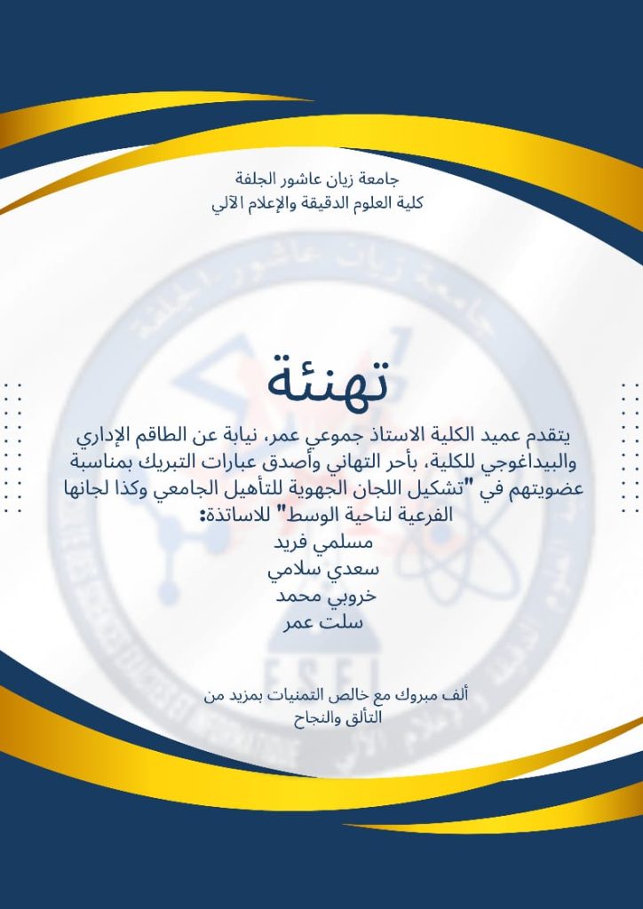 الرئيسية/العمادة/تهنئة بمناسبة العضوية في تشكيل اللجان الجوية للتأهيل الجامعي تهنئة بمناسبة العضوية في تشكيل اللجان الجوية للتأهيل الجامعي