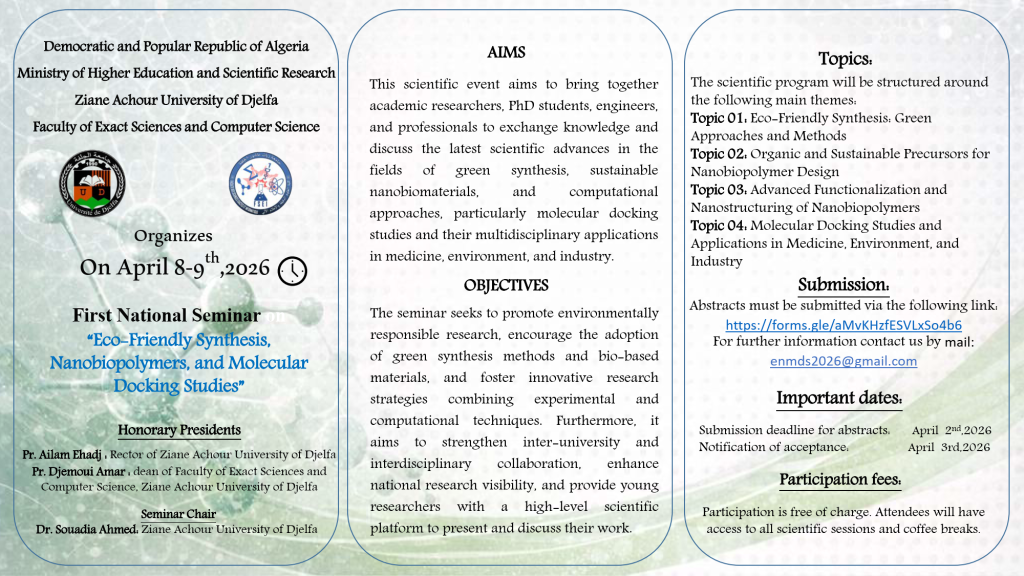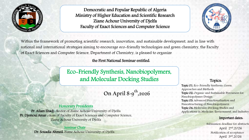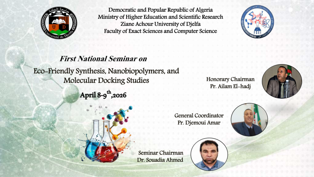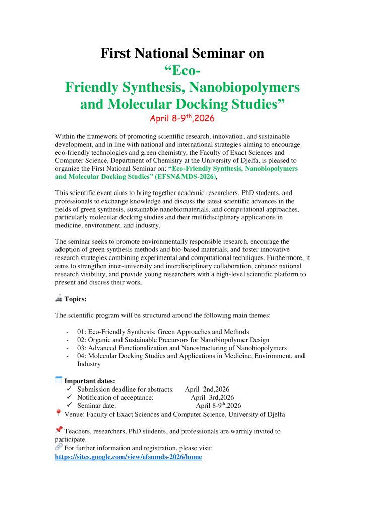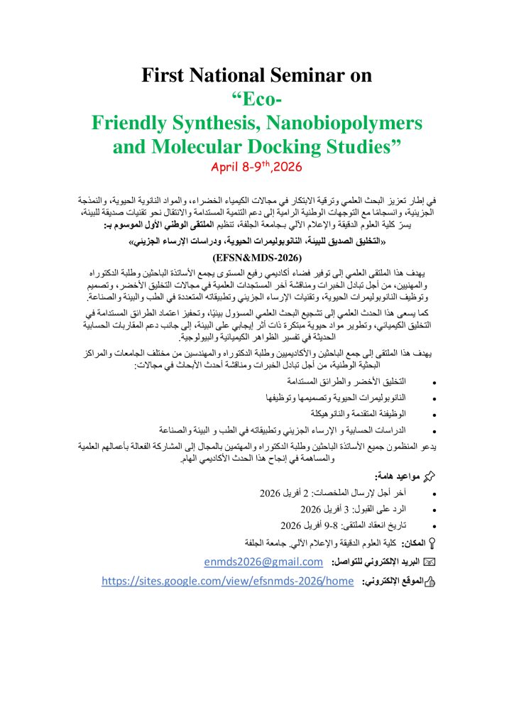 الرئيسية/العمادة/First National Seminar on : Eco-Friendly Synthesis, Nanobiopolymers and Molecular Docking Studies First National Seminar on : Eco-Friendly Synthesis, Nanobiopolymers and Molecular Docking Studies الرابط: https://sites.google.com/view/efsnmds-2026/home