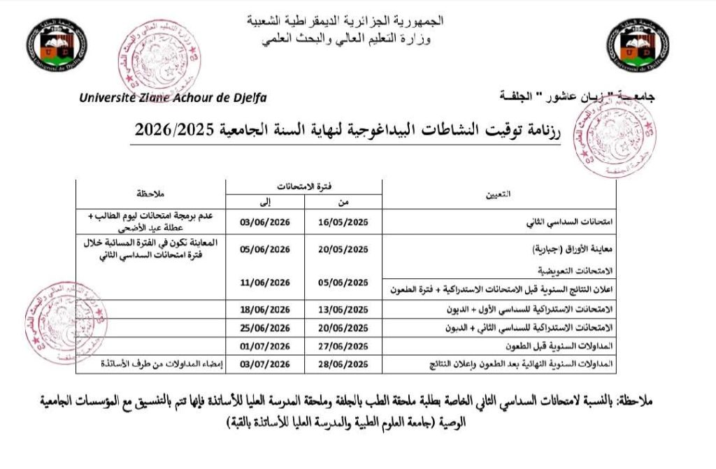 الرئيسية/العمادة/رزنامة توقيت النشاطات البيداغوجية لنهاية السنة الجامعية 2025/2026 رزنامة توقيت النشاطات البيداغوجية لنهاية السنة الجامعية 2025/2026